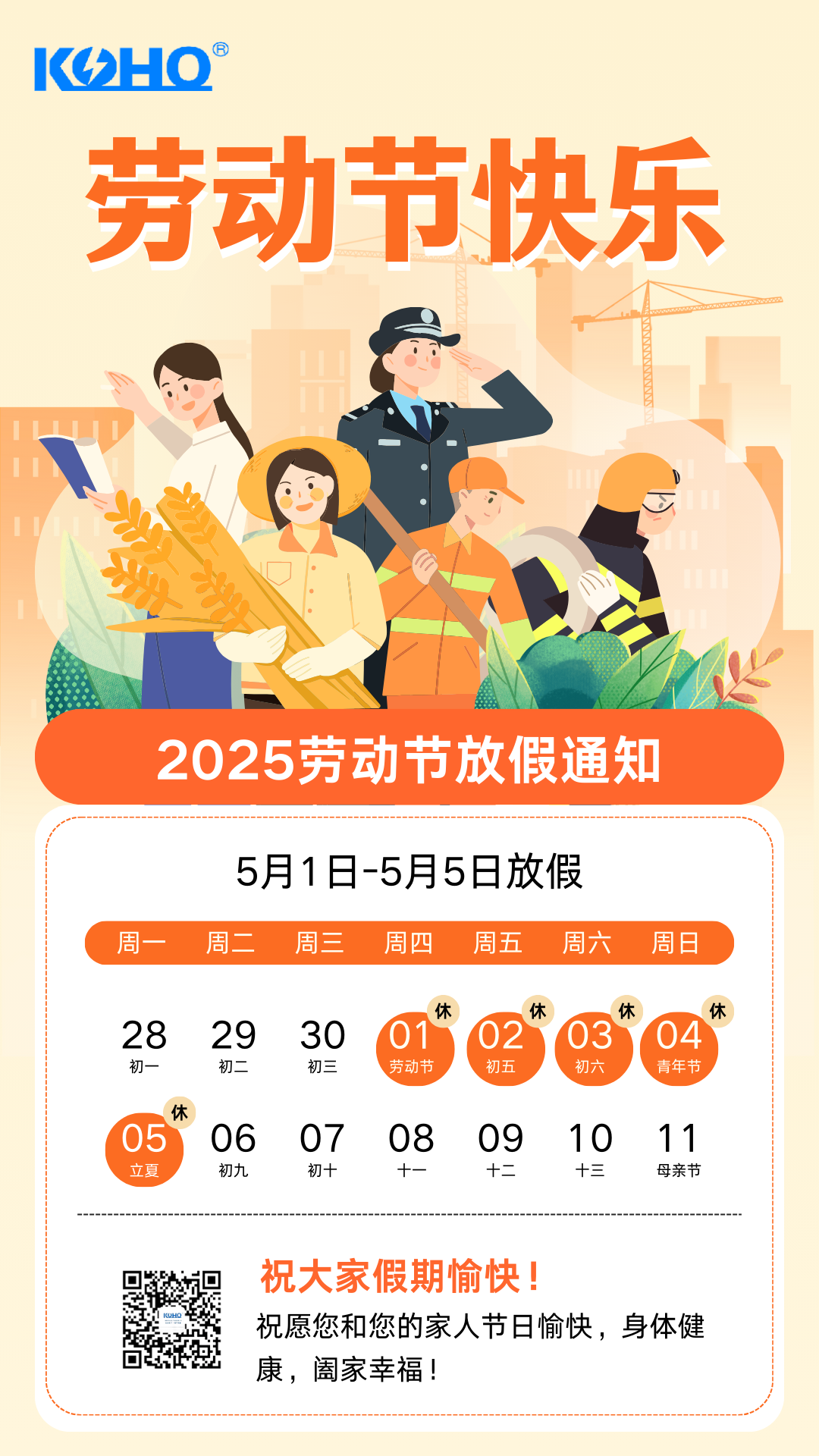 放假時間:2025年5月1日(星期四)至5月5日(星期一),共計5天。5月6日(星期二)恢複正常上班。