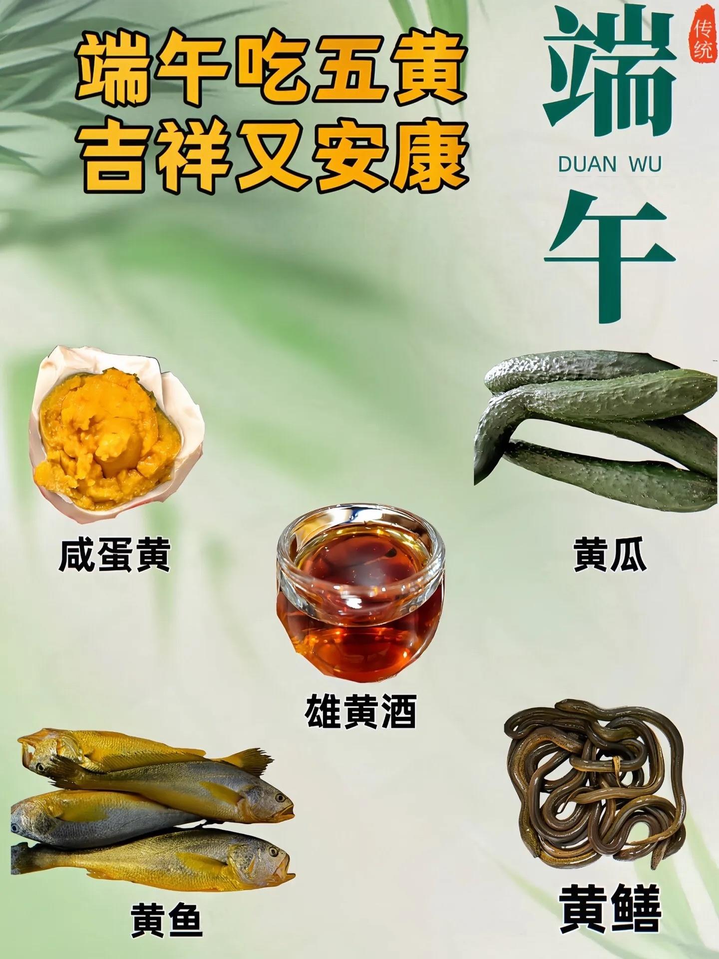 在端午節,還有吃五黃的習俗,即黃魚、黃瓜、黃鱔、鹹鴨蛋黃、雄黃酒。這些食物在端午時節食用,被認為可以祛病防疫、增強體質。