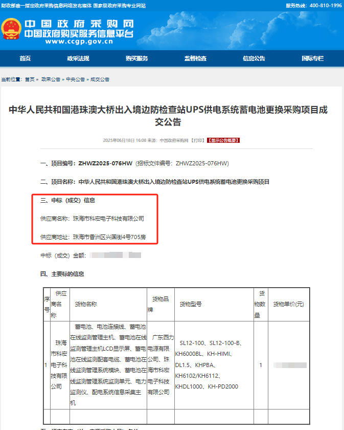 成功中標“中華人民共和國港珠澳大橋出入境邊防檢查站UPS供電係統蓄電池更換采購項目”。