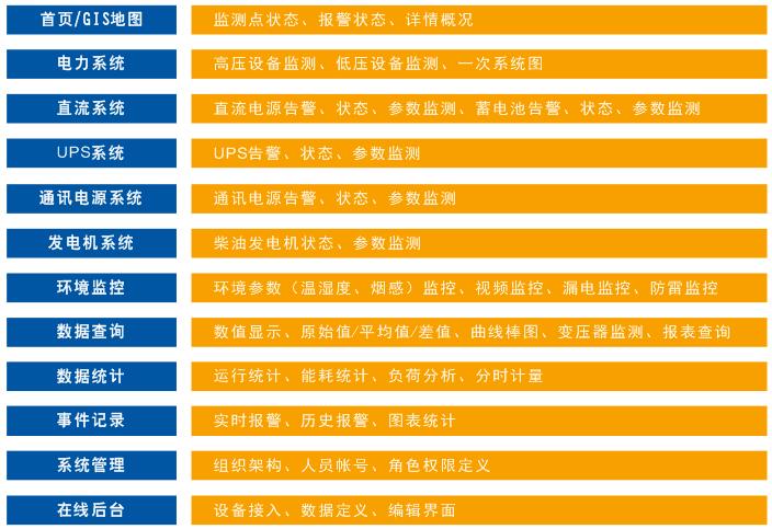 雷達站綜合電力監控係統包含有電力監控子係統、直流監控子係統、UPS監控子係統、通訊電源監控子係統、柴油發電機監控子係統、環境監控子係統等子係統。各子係統為獨立模塊,互不影響;各模塊可以自由組合,構成統一監控平台。